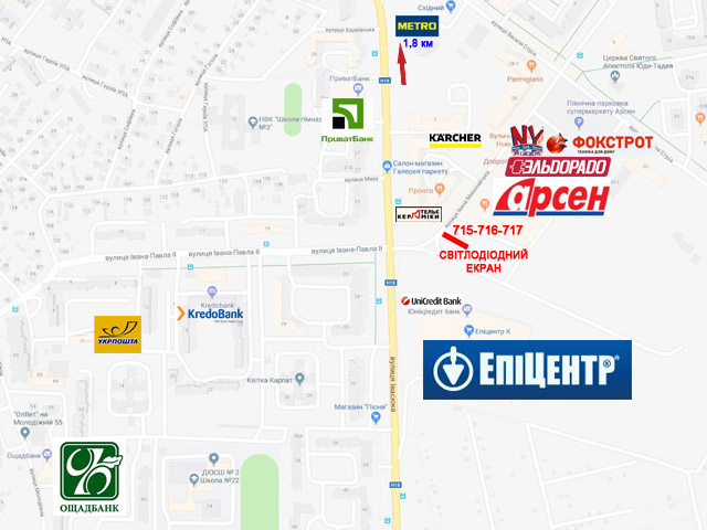 Транспортна розв'язка, ТЦ Арсен, Епіцентр, Продуктовий супермаркет, Торговий центр, Будівельний магазин, До центру / в центр Івано-Франківська, ЖК СТОЖАРИ, Зупинка громадського транспорту, Кінотеатр " КІНОБУМ ", Макдональдс ( Mcdonalds ), МЕБЛЕВИЙ супермаркет, МЕТРО, Новобудова, Перехрестя, Пішохідний перехід, ринок, Світлофор, Фокстрот, Школа